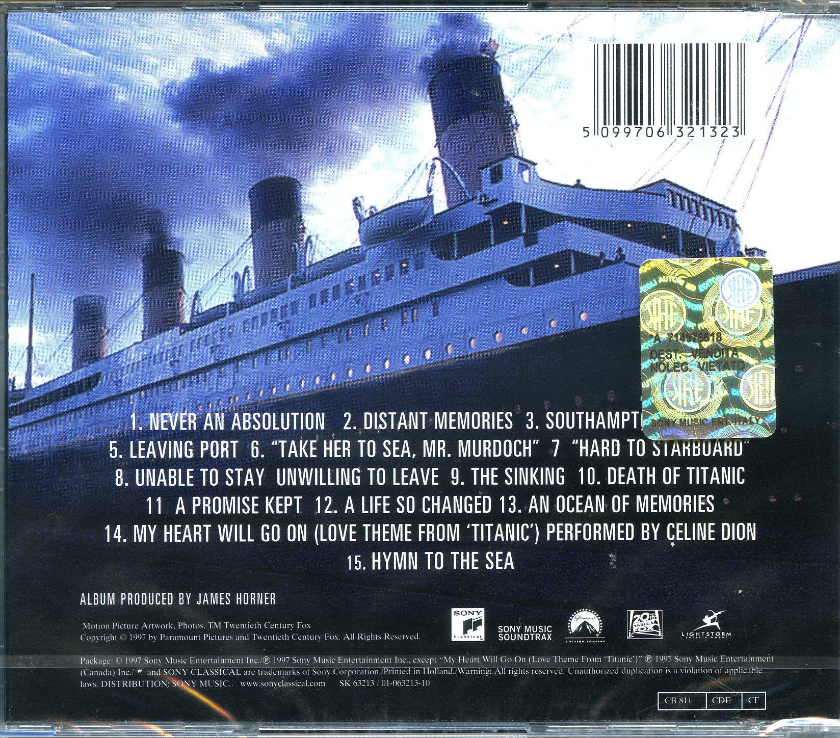 Lista Brani 1 -Never An Absolution 2 -Distant Memories 3 -Southampton 4 -Rose 5 -Leaving Port 6 -"Take Her To Sea, Mr. Murdoch" 7 -"Hard To Starboard" 8 -Unable To Stay, Unwilling To Leave 9 -The Sinking 10 -Death Of Titanic 11 -A Promise Kept 12 -A Life So Changed 13 -An Ocean Of Memories 14 -My Heart Will Go On 15 -Hymn To The Sea